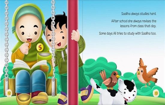 Studying Hard (Akhlaaq Building Series), Full Colour Illustration Introducing Children to Good Manners and Character Good study habits get good results. Learn to study well and the results will come. Saaliha always studies hard. After school she always revises the lessons from class that day. Some days Ali tries to study with Saaliha too.