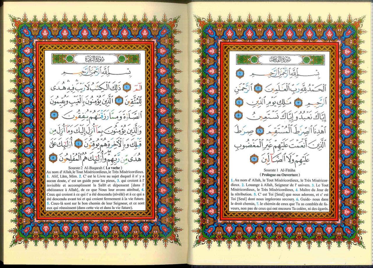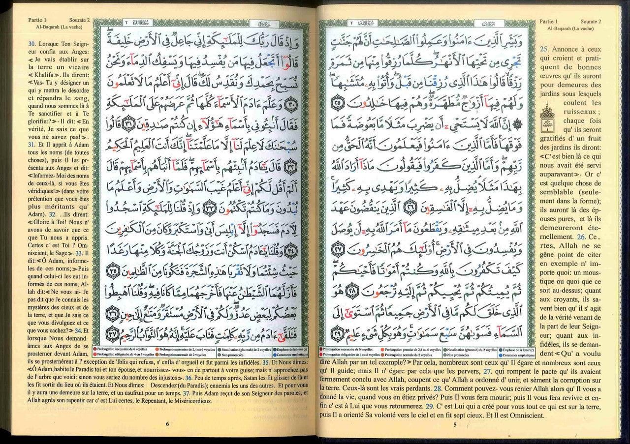 This complete Colour Coded Tajweed Quran comes with a nice and beautiful hard cover. Meanings of the Quranic versus are translated into French and placed on the margins around the Arabic text. This Tajweed Quran is in Hafs narration. All our Tajweed Quran products - including this Quran-- come with the following: 1- Colour coded letters: to present the Tajweed rules, very good and simple way to learn and apply Tajweed rules . 2- A set of very useful indexes such as: Surahs Colour Index, Subject Index. 3- Tajweed rules explained in details with helpful illustration.