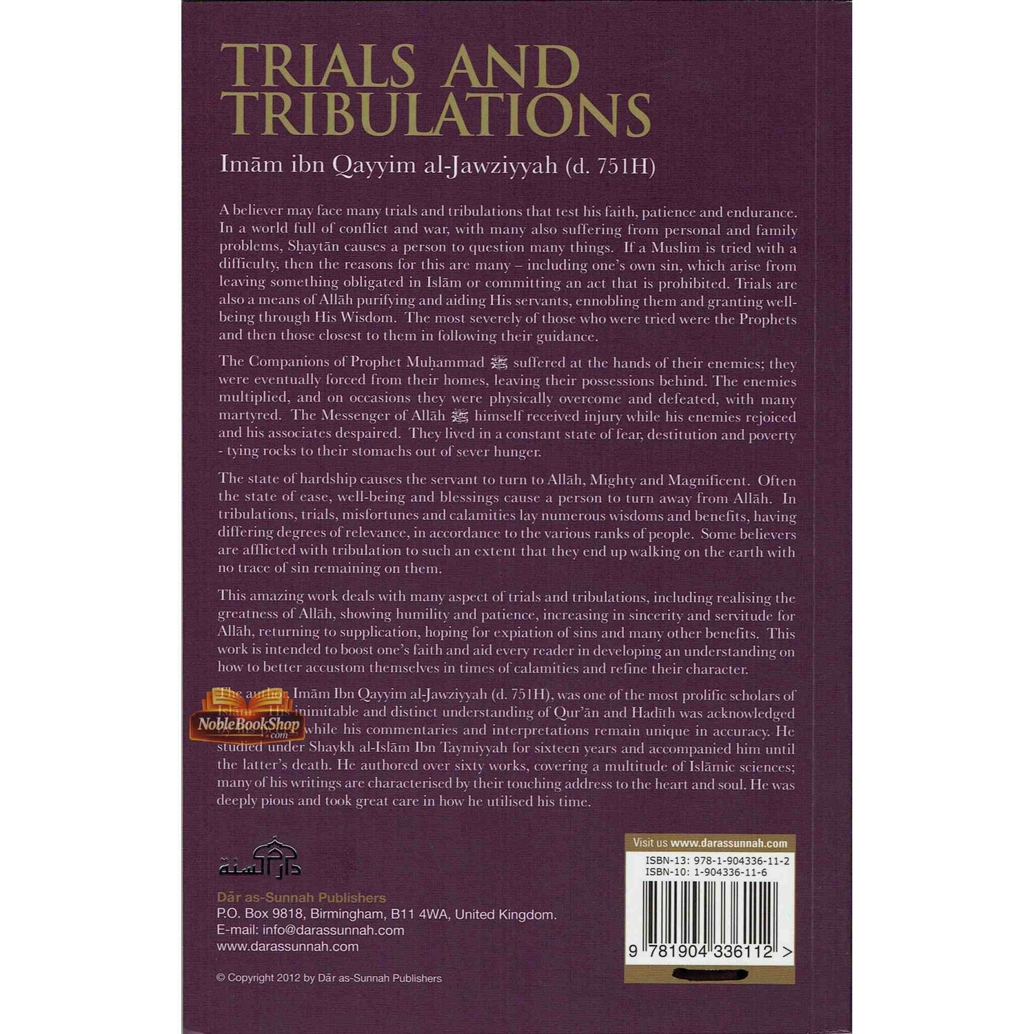 A believer may face many trials and tribulations to test their faith, patience and endurance. In a world full of conflicts, wars, disasters and many personal and family problems, Shaytan can cause a person to question many things. If a Muslim is tried, in body, wealth, or any other difficulty, the only reason for this is ones sins – due to leaving something obligatory or committing a prohibited act. However it is also a means of Allah aiding His servants, ennobling one and granting well-being. The most severely tried were the Prophets and then those closest to them. The Companions of the Prophet Muhammad (saw) were evicted from their homes, leaving their possessions behind, their enemies multiplied, on occasions they were overcome and defeated, many were martyred. The Messenger of Allah (saw) received injury to his face, his molar teeth was broken; his helmet was crushed into his head, while his enemies rejoiced and his associates despaired. They lived in a constant state of fear, destitution and poverty - tying rocks to their stomachs out of sever hunger. The Messenger of Allah (saw) never ate to his fill of bread twice in any one day. He was injured in various ways to the point that they accused the chastity of his most beloved wife. The state of hardship causes the servant to turn to Allah, Mighty and Magnificent. Often the state of ease, well-being and blessings cause a person to turn away from Allah. In tribulations, trials, misfortunes and calamities lay numerous benefits, having differing degrees of relevance, in accordance to the various ranks of people. The believers are afflicted with tribulation to such an extent that they end up walking on the earth with no trace of sin remaining on them. This amazing work deals with many aspect of trials and tribulations, including realising the greatness of Allah, humility, dejection of servitude, sincerity for Allah, being patient, supplication, expiation of sins and many other benefits and wisdoms. This Iman boosting work will aid every reader and it will develop an understanding that a believer should accustom themselves with, in times of calamities. The author, Imam Ibn Qayyim al-Jawziyyah (d. 751H), was one of the most prolific scholars of Islam. He studied under Shaykh al-Islam Ibn Taymiyyah for sixteen years and accompanied him up and till his death; learning a great deal of knowledge from him. He authored over sixty works, covering a multitude of Islamic sciences; his writings are characterised by their touching address to the heart and soul. He was deeply religious and very pious.