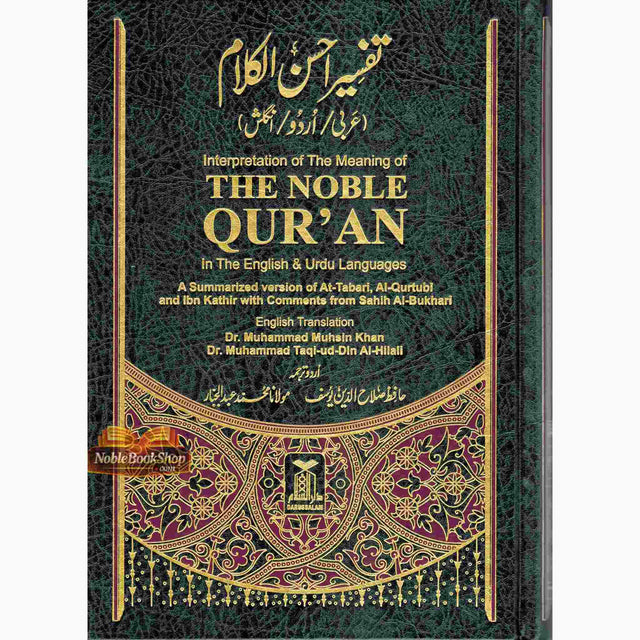 SL:04AL2 New Edition of the Noble Quran with Persian script Arabic and translation & tafseer in both English and Urdu languages. Right column of each page has Arabic text with Urdu translation in the middle and English translation in the left column of each page. The 3 columns are followed by English tafsir followed by Urdu tafseer on the bottom of each page (where it exists). The Noble Quran - English translation by: Dr. Muhammad Muhsin Khan and Dr. Muhammad Taqi-ud-Din Al-Hilali. Tafseer Ahsan-ul-Kalam - Urdu translation by: Hafiz Salah-ud-Din Yusuf and Maluna Muhammad Abdul Jabbar. Interpretation of the meanings of the Noble Qur'an with Arabic text in the modern English language. A summarized version of At-Tabari, Al-Qurtubi and Ibn Kathir with comments from Sahih Al-Bukhari. This summarized 1 volume version offers brief commentary and Ahadith wherever necessary. This unique combination of commentary and relevant Ahadith makes this a very useful study reference tool. The Arabic text is taken from Mushaf al Madinah.