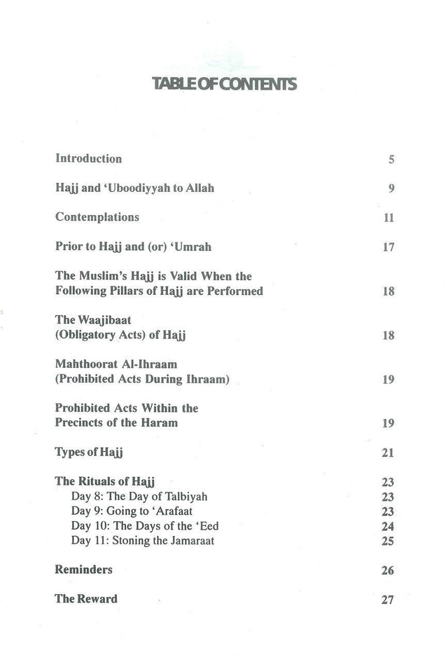 Hajj is to set out for Makkah to worship ALLAH by performing certain religious rights in accordance with the Prophets صلی الله علیه وآلیه وسلم sunnah. It is a time in which to call upon ALLAH to purify the self from any worship to anyone other than him. This booklet explains the basic rights of Hajj. It also notes that the tawheed of Allah requires the Muslim to follow the perfect way of worship, demonstrated by Muhammad صلی الله علیه وآلیه وسلم and is understood by the Sahaabah who were the best of mankind.