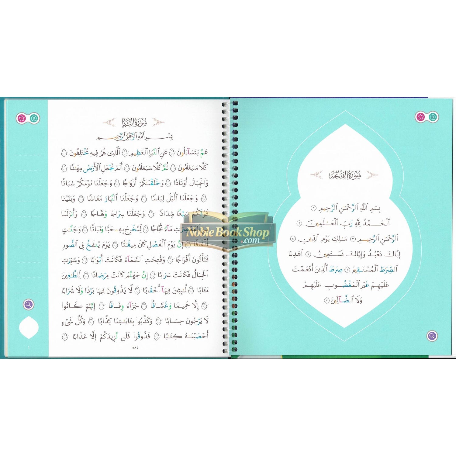 Juz Amma by Learning Roots is a hardback book, with laminated pages and a spiral-bound spine, making it durable with flat laying pages that turn back on themselves, allowing your child to focus on one page at a time.