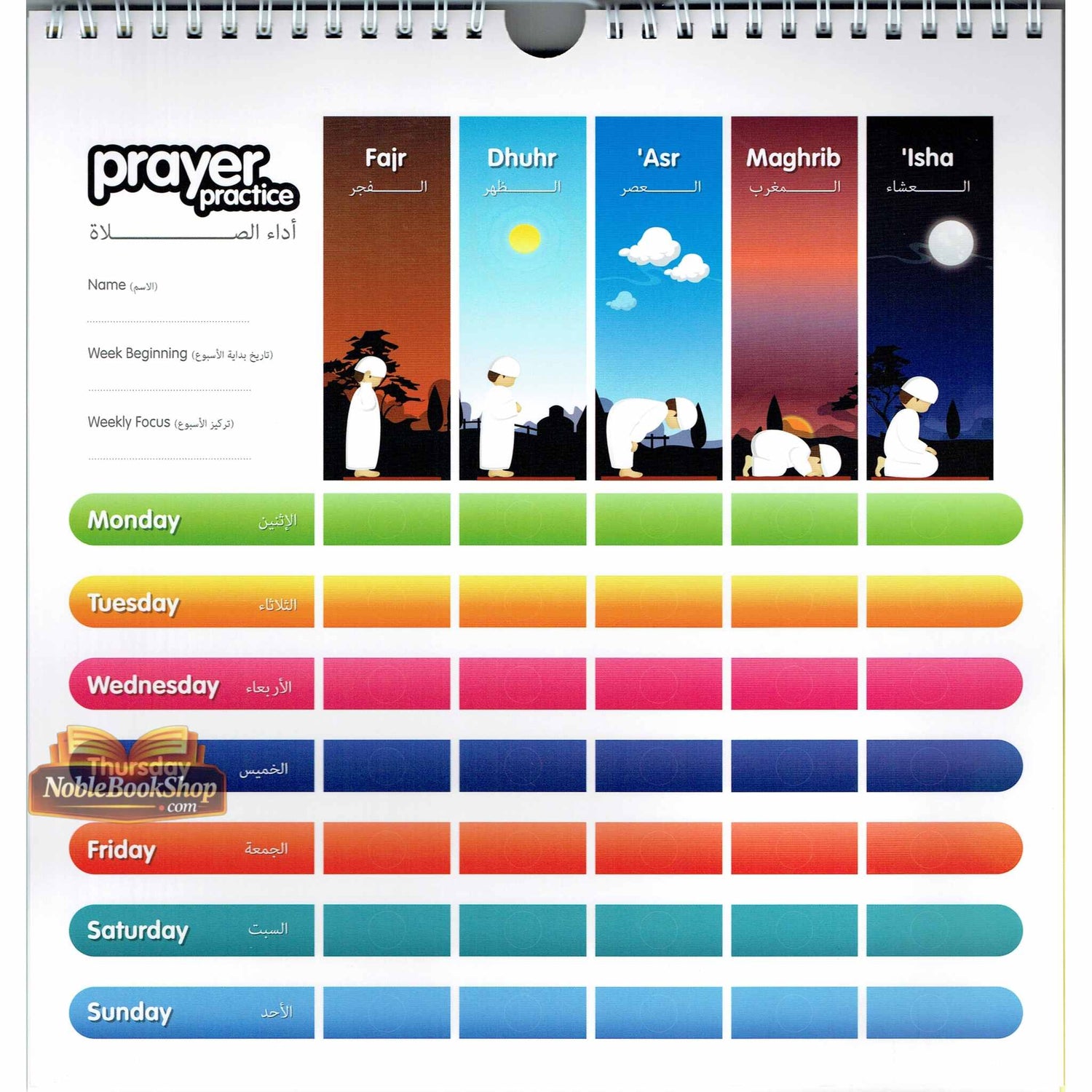 SL: 012 Prayer Practice is great for motivating your children to perform the five daily prayers. Each set contains eight colourful charts and accompanying stickers as well as a children's Qibla direction arrow all bound together in a flip chart. The charts can also be used to focus on particular aspects of the prayer. Weekly focuses may include topics such as concentration in prayer, praying on time and performing actions correctly amongst others. It's the perfect resource to accompany children in their introduction to the prayers. Each set comes with shiny gloss page finishes and a calendar style binding for easy hanging on walls.