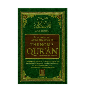 Interpretation of the meanings of the Noble Qur'an with Arabic text in the modern English language. A summarized version of At-Tabari, Al-Qurtubi and Ibn Kathir with comments from Sahih Al-Bukhari. This 1 volume summarized version offers brief commentary and Ahadith wherever necessary. This unique combination of commentary and relevant Ahadith makes this a very useful study reference tool.