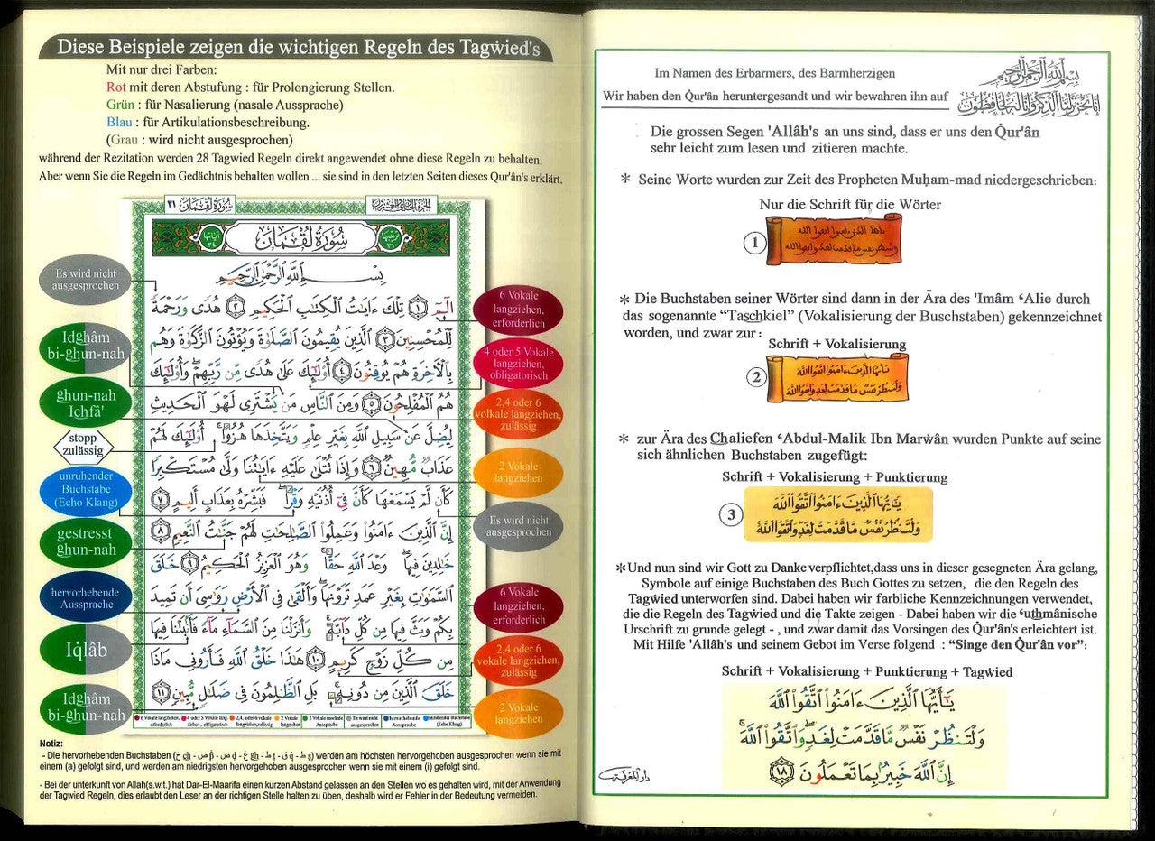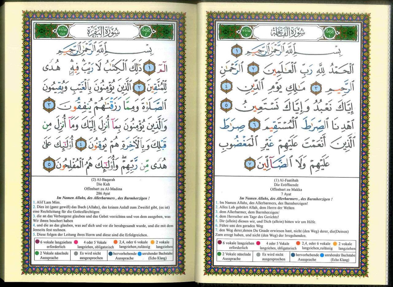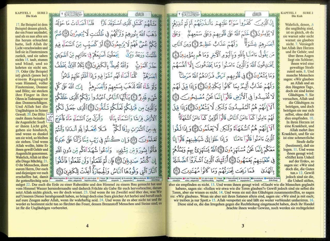 SL: 05AL3 This complete Colour Coded Tajweed Quran comes with a nice and beautiful hard cover. Meanings of the Quranic versus are translated into German and placed on the margins around the Arabic text. This Tajweed Quran is in Hafs narration. All our Tajweed Quran products - including this Quran-- come with the following: 1- Colour coded letters: to present the Tajweed rules, very good and simple way to learn and apply Tajweed rules . 2- Obvious script: extra spaces were added between the words in order to make it easier to read and recite the Quran. 3- Permissible stops: long spaces were added at certain places where it is permissible to stop. It helps to avoid stopping at wrong places or times. 4- A set of very useful indexes such as: Surahs Colour Index, Subject Index. 5- Tajweed rules explained in details with helpful illustration.