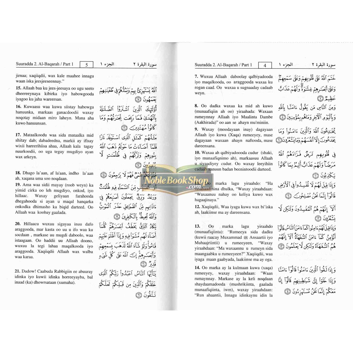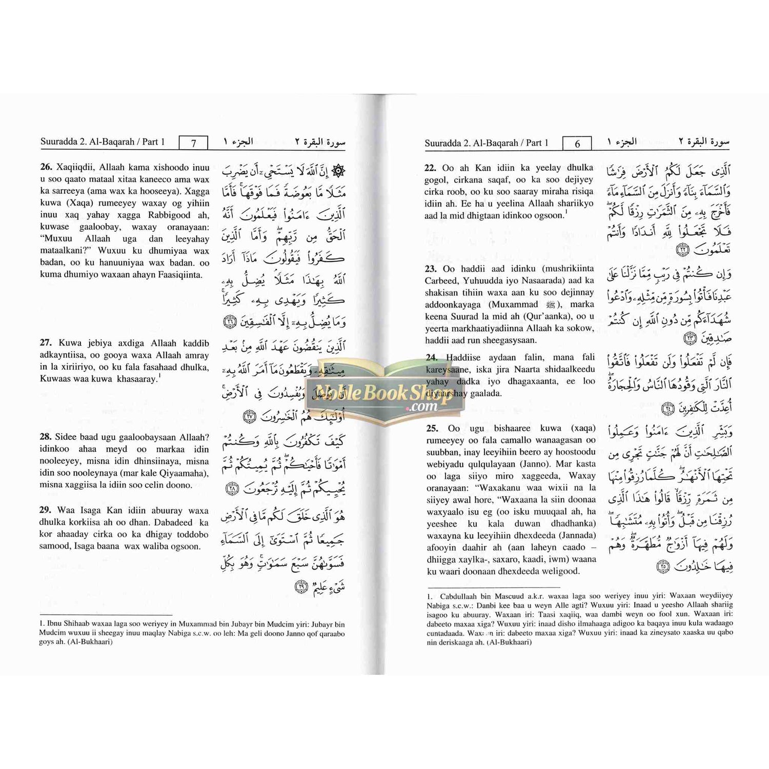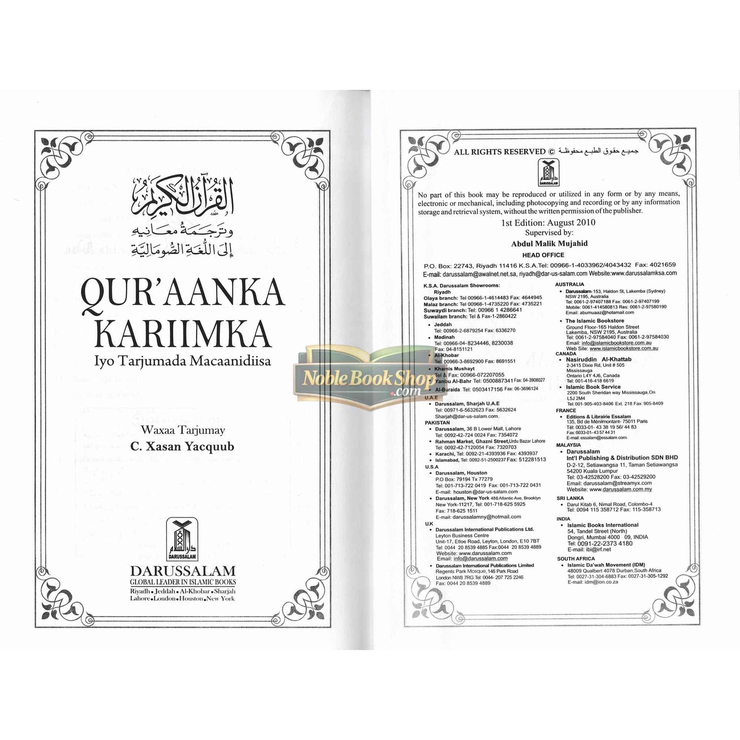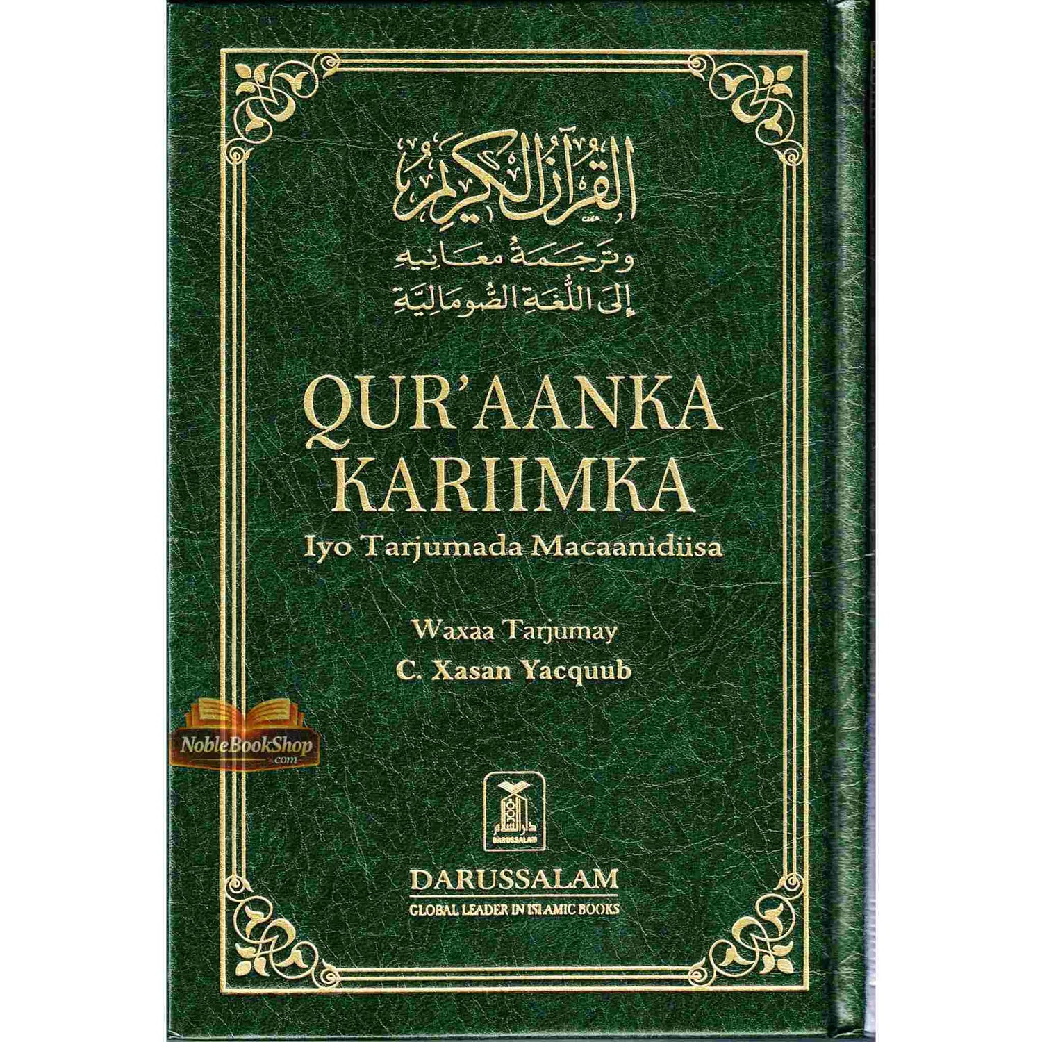 Quraanka Kariimka - Iyo Tarjamada Macnihiisa Ee Afka Soomaaliga / Afsoomaali - اللغة الصومالية Interpretation of the meanings of the Noble Qur'an with Arabic text in the Somali language. A summarized version of At-Tabari, Al-Qurtubi and Ibn Kathir with comments from Sahih Al-Bukhari. This summarized 1 volume version offers brief commentary and Ahadith wherever necessary. This unique combination of commentary and relevant Ahadith makes this a very useful study reference tool.
