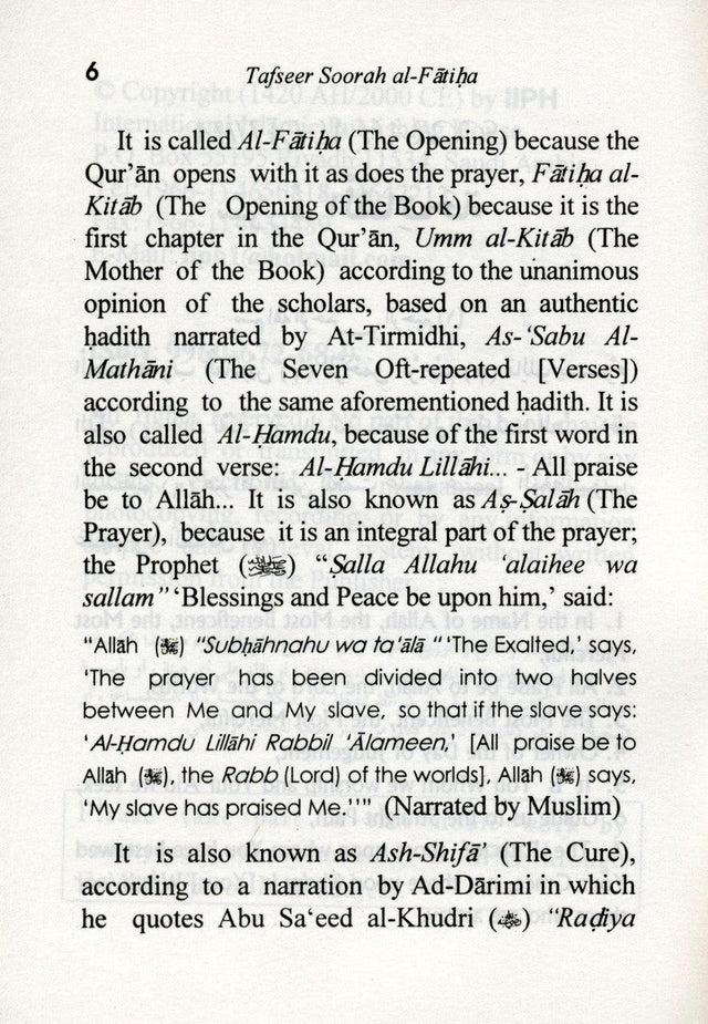 SL: 01CL1 Whenever a Muslim performs his daily prayers, he has to begin every Raka by reciting Soorah al-Fatiha. But some of us may be ignorant of the essence of this surah with which the Holy Qur'an opens, thought it was not revealed first. In this book Sameh Strauch explains that essence, producing stories of Fatiha's cure effect, the other names given to it and disagreement among Muslim scholars on whether "Bismillah" is a part of that soorah.