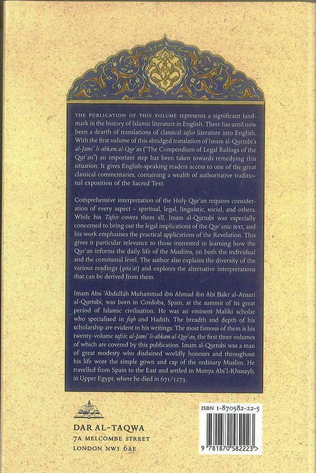 The publication of this volume represents a significant landmark in the history of Islamic literature in English. There has until now been a dearth of translations of classical tafsir literature into English. With the first volume of this abridged translation of Imam al-Qurtubi's al-Jami' li-ahkam al-Qur'an ("The Compendium of Legal Rulings of the Qur'an"), an important step has been taken towards remedying this situation. It gives English-speaking readers access to one of the great classical commentaries, containing a wealth of authoritative traditional exposition of the Sacred Text. Comprehensive interpretation of the Holy Qur'an requires consideration of every aspect -- spiritual, legal, linguistic, social, and others. While his Tafsir covers them all, Imam al-Qurtubi was especially concerned to bring out the legal implications of the Qur'anic text, and his work emphasizes the practical applications of the Revelation. This gives it particular relevance to those interested in learning how the Qur'an informs the daily life of the Muslims, on both the individual and communal level. The author also explains the diversity of the various readings (qira'at) and explores the alternative interpretations that can be derived from them?