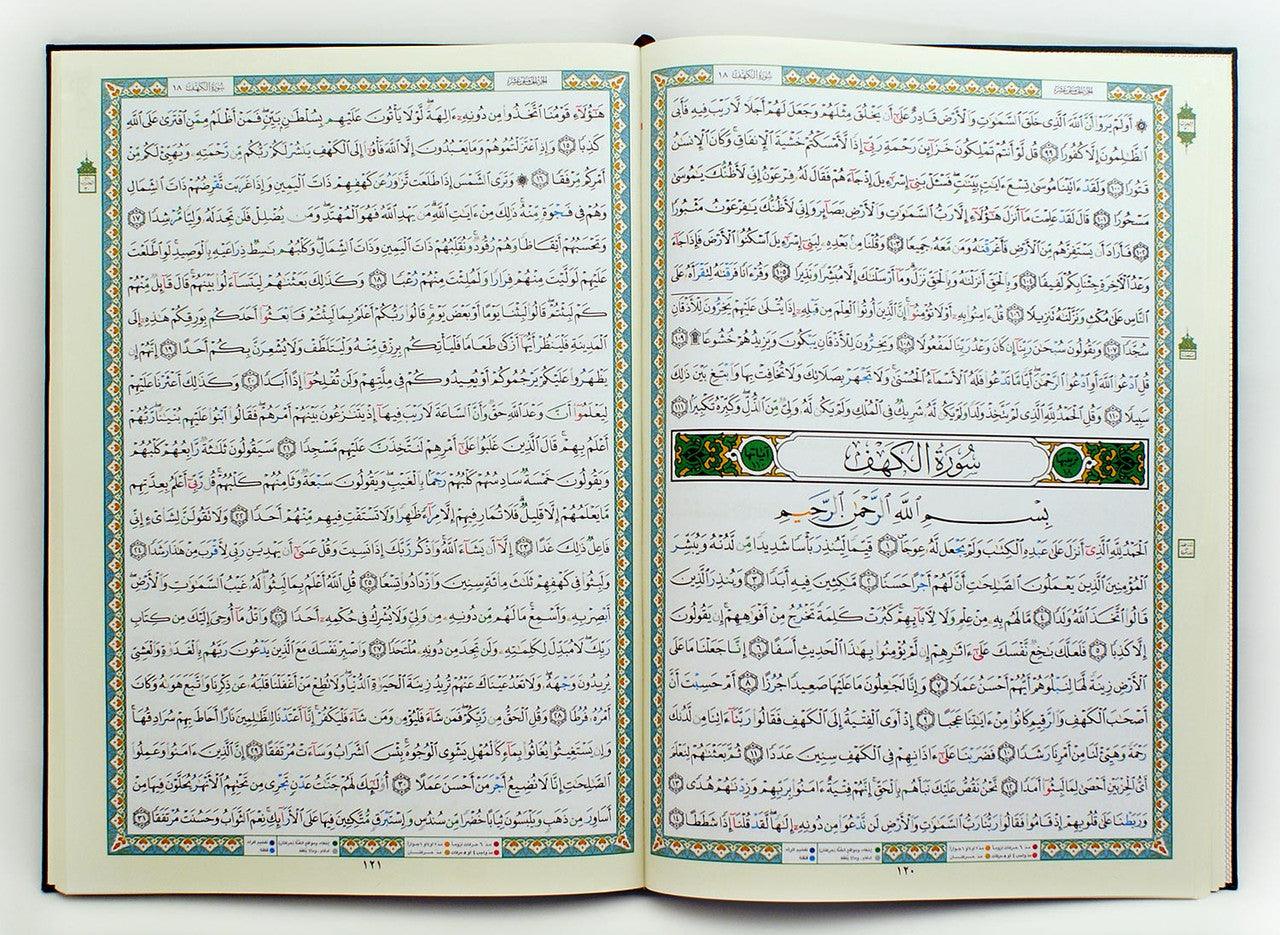This Quran comes in 247 pages instead of 605 pages, that's because we combined every one Juzz in eight pages instead of 20 pages, where every two pages contain a quarter of Juzz. This helps the Quran reciter to concentrate on the context and the meanings by having an overall view of the Ayas and the Quranic text. Please have a look on the images to see example of an internal page.