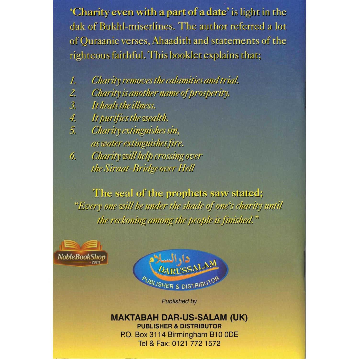 33B The author referred a lot of Quraanic verses, Ahaadith and statements of the righteous faithful. This booklet explains that Charity removes the calamities and trial. Charity is another name of prosperity. It heals the illness. It purifies the wealth. Charity extinguishes sin, as water extinguishes fire Charity will help crossing over the Siraat-Bridge over hell