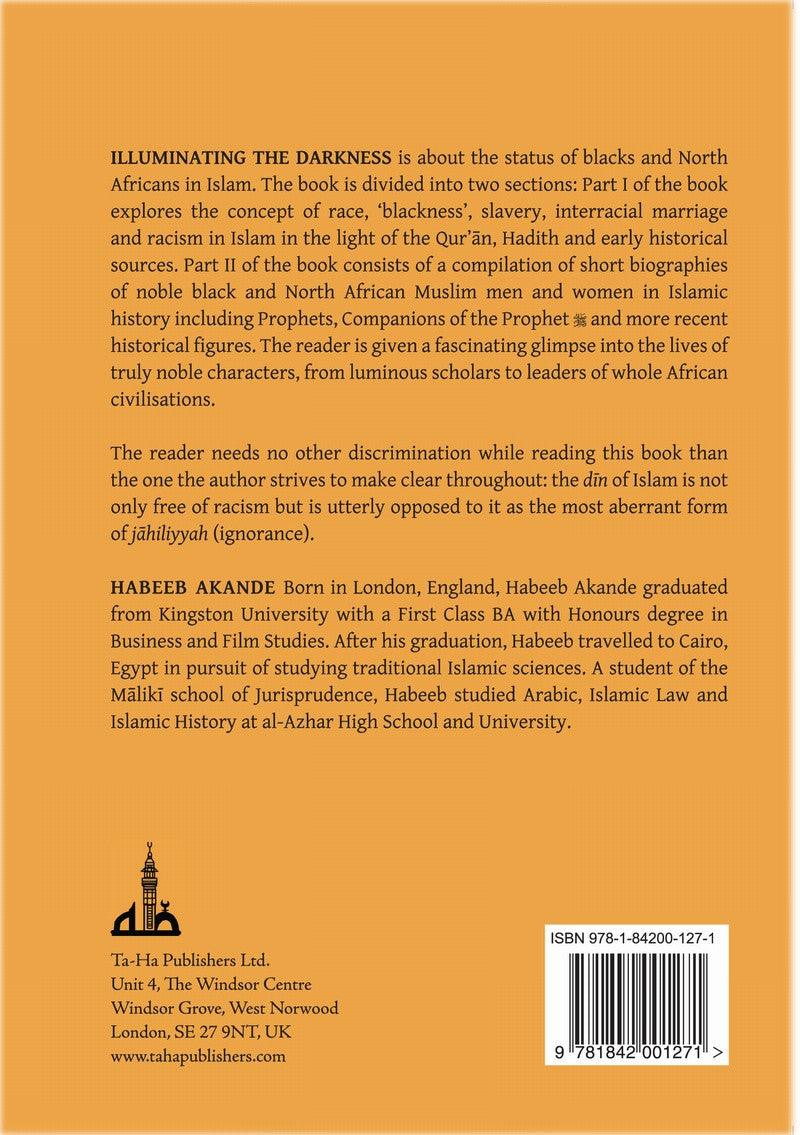 illuminating the Darkness is about the status of blacks and North Africans in Islam. The book is divided into two sections: Part l of the book explores the concept of race, 'blackness', slavery, interracial marriage and racism in Islam in the light of the Qur'an, Hadith and early historical sources. Part ll of the book consists of a compilation of short biographies of noble black and North African Muslim men and women in Islamic history including Prophets, Companions of the Prophet صلی الله علیه وآله وسلم and more recent historical figures. The reader is given a fascinating glimpse into the lives of truly noble characters, from luminous scholars to leaders of whole African civilisations. The reader needs no other discrimination while reading this book than the one the author strives to make clear throughout: the din of Islam is not only free of racism but is utterly opposed to it as the most aberrant form of jahiliyyah (ignorance).