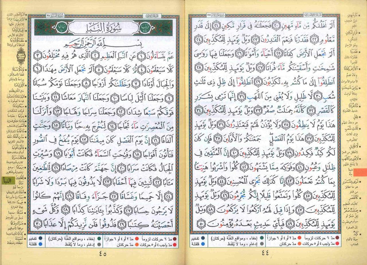 This is Amma, Tabarak and Qad Same'a parts of the Tajweed Quran, parts twenty eight, twenty nine and thirty, which starts from surah "Al-Mujadila " till sura "An-Nas". Considering that these Parts contain small surahs; this item is a perfect start for kids, beginners and students. This product comes in the standard portrait form, combining the three parts (28, 29 and 30) with a nice glossy soft cover. Each page contains 15 lines as any standard Quran, with an interpretation of selected words placed on the margins on every page. This item of the Tajweed Quran is in Hafs narration. All our Tajweed Quran products - including this item - come with the following: 1- Tajweed rules explained in details with helpful illustration. 2- A set of very useful indexes such as: Surahs Colour Index, Subject Index. 3- Colour coded letters: to present the Tajweed rules, very good and simple way to learn and apply Tajweed rules. 4- Obvious script: extra spaces were added between the words in order to make it easier to read and recite the Quran. 5- Permissible stops: long spaces were added at certain places where it is permissible to stop. It helps to avoid stopping at wrong places or times.