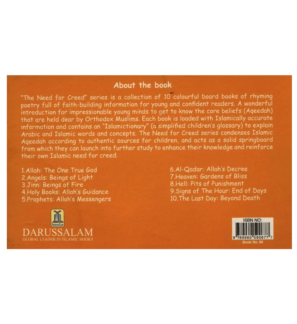The Need For Creed series is a collection of 10 colourful board books of rhyming poetry full of faith-building information for young minds to get to know the core beliefs (Aqeedah) that are held dear by Orthodox Muslims. Each book is loaded with Islamically accurate information and contains an "Islamictionary" (a simplified childrens glossary) to explain Arabic and Islamic words and concepts. The Need for Creed series condenses Islamic Aqeedah according to authentic sources for children, and acts as a solid springboard from which they can launch into futher study to enhance their knowledge and reinforce their own Islamic need for creed